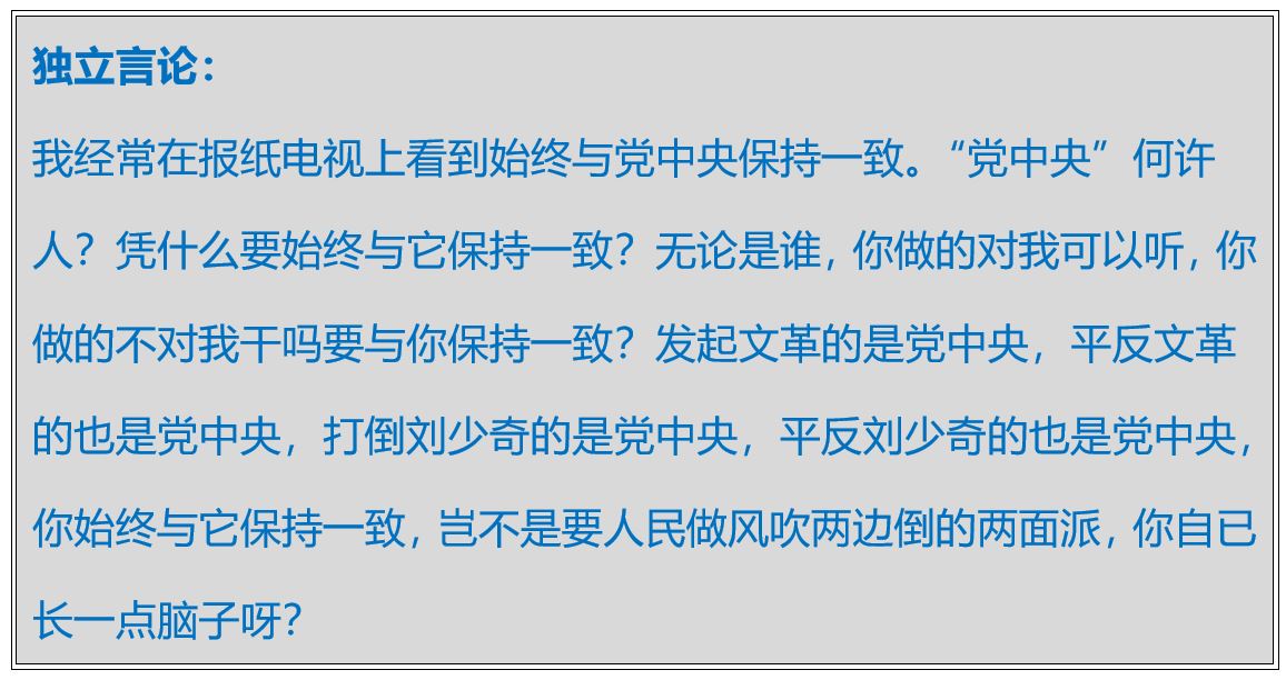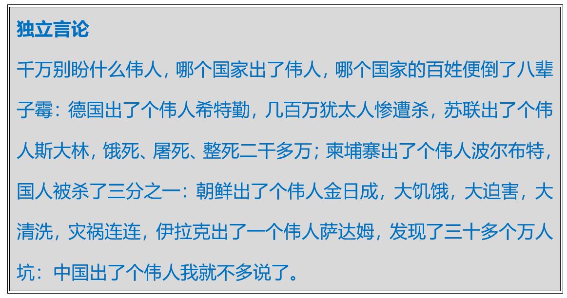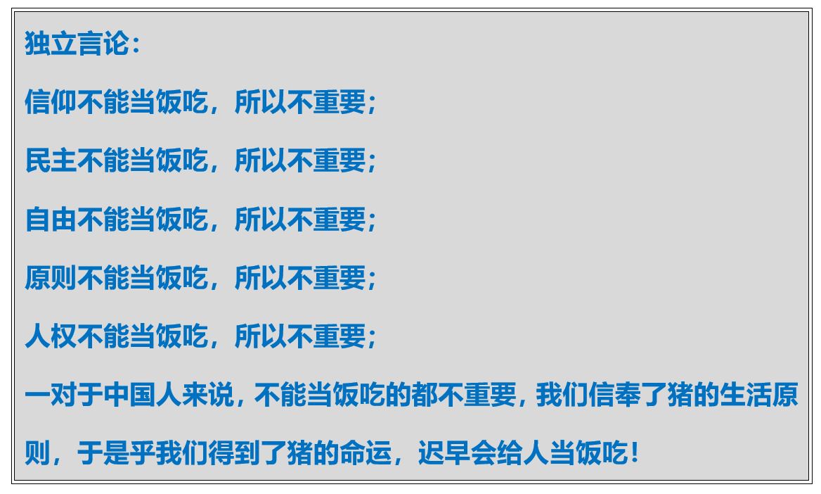 而现在的人,动不动以为搞政治,杀头的罪,吓得不敢面对真相。其实,您不明真相,跟随一只嗜血的鬼(西方叫幽灵),听任它在东方的政治舞台上,涂脂抹粉迷惑人,专横跋扈欺压人,坏事干尽……一旦报应临头遭天灭,你还跟着它,那才真可怕!