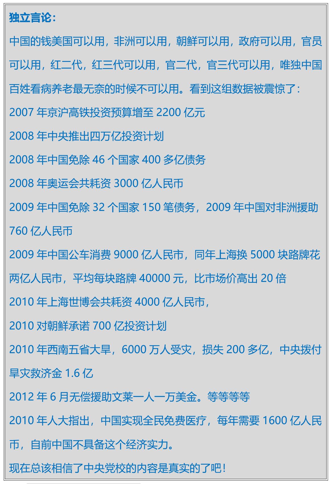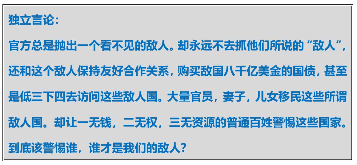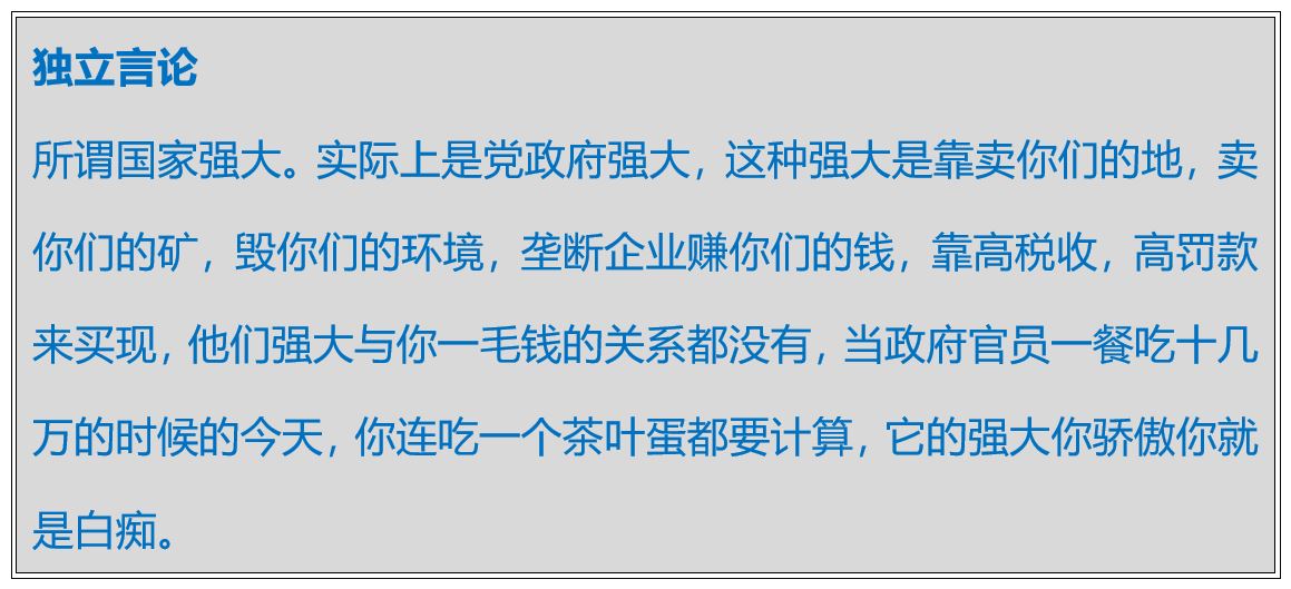 今天的中国满目疮痍,贫富悬殊,权大于法,甚至上访喊冤也被抓去坐牢。今天当权者(共产党)带给中国人民的灾难说不尽,道不完,今天的中国真象共产党国歌里唱的那样,中华民族到了最危险的时候了,我们的宝藏——矿被挖空了,我们的钱被淘空了,我们吃的东西也不安全了,我们的生态环境,生存环境被破坏,数千年的文化,文明被推毁,人们的道德在一日千里往下滑,我们没有给子孙后代留下任何有价值的东西。到了这一步的时候中华民族不是到了最危险的时候了吗?